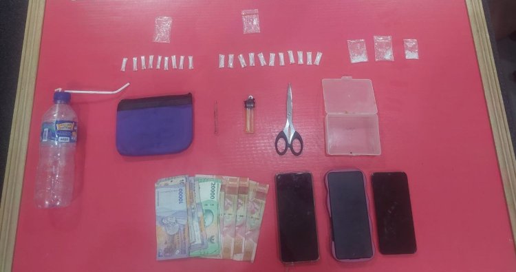 Dari hasil penggeledahan di TKP, petugas berhasil mengamankan sejumlah barang bukti antara lain 3 poket sedang dan 20 poket kecil jenis sabu dengan total berat bruto 9, 83 gram, 1 buah pipa kaca, gunting, korek gas, alat hisap/bong, kotak bening, serta dompet warna ungu, 3 unit Hp Android, dan uang tunai senilai Rp. 550.000, .